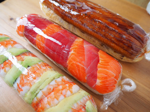 3. Place the rice on sashimi and twist wrap the whole thing with the cling film